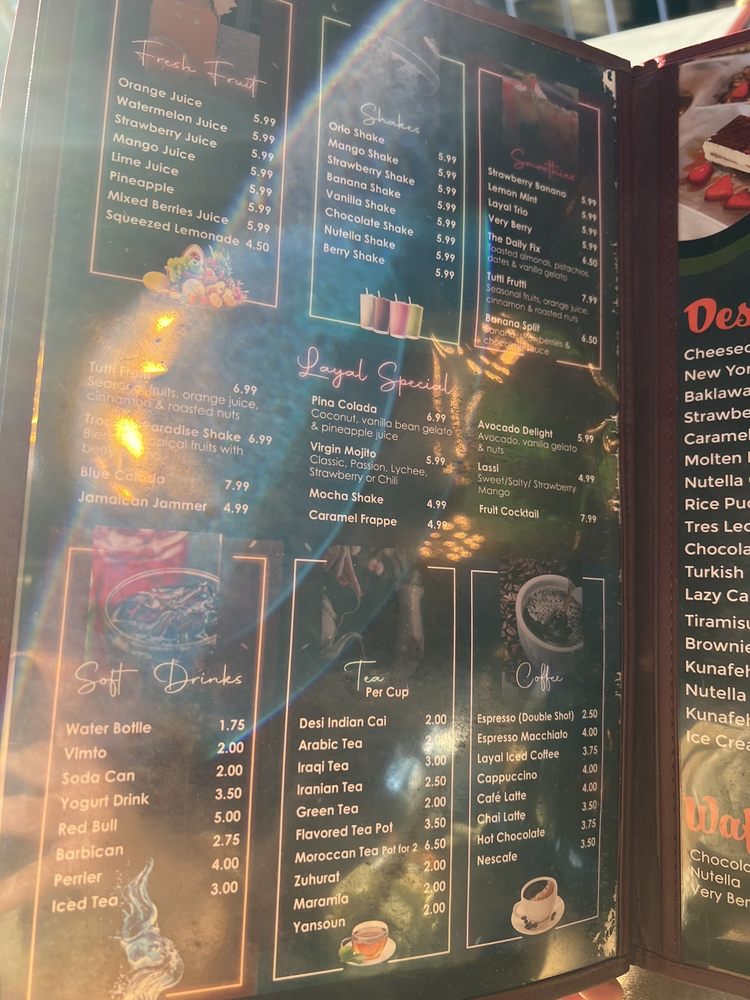 Layal is a Mediterranean restaurant located at 6328 Richmond Ave in Houston, TX. This casual spot is perfect for lunch, dinner, or late-night cravings with a menu offering Pescatarian and Vegan options. The ambiance, hookah, and non-alcoholic beverages like fresh juices, Arabic coffee, and frappes make Layal a unique dining experience. Customers praise the fresh and hot Manaqeesh, delicious hummus, and flavorful kibbes. The service can be hit or miss depending on the server, but the friendly atmosphere, clean dine-in area, and background music make it a great spot for families, friends, or even working on your laptop. Overall, Layal is a gem for delicious Mediterranean food, refreshing beverages, and a relaxed setting.